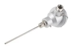PRT z głowicą KNE i nadajnikiem. Termometr bezprzewodowy klasy B typu B typu PT100 z głowicą KNE i nadajnikiem. Dostępny w próbówce o długości 150 mm Średnica 6 mm w 316 stali nierdzewnej Dostępnych jest kilka zakresów nadajnika IP67 Głowica połączeniowa odporna na warunki atmosferyczne ze stopu aluminium Temperatura znamionowa czujnika od -100 °C do +450 °C. Spełnia wymogi normy IEC 751