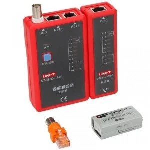 UT681C produkcji Unit to tester kabli i przewodów sieciowych zakończonych wtykami RJ11 RJ45 BNC. Tester okablowania sieciowego UT681C składa się z nadajnika i odbiornika. Wynik testu jest obrazowany przy pomocy 8 diod świecących LED. Test kabli i przewodów wykonywany na okoliczność powstania przerw, zwarć, przejścia w obwodzie elektrycznym.