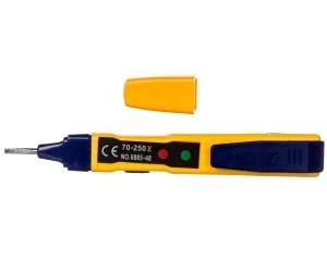 W asortymencie marki Emos dostępne są testery napięcia, których powyższa wersja posiada funkcję bezkontaktowego wykrywania napięcia. Produkt wykonuje testy jednobiegunowe. Tester posiada wskaźnik napięcia typu LED oraz optyczny i akustyczny wskaźnik ciągłości. Artykuł ten jest zasilany za pomocą akumulatora lub baterii. Zakres pomiaru napięcia sięga od 0 V do 250 V.