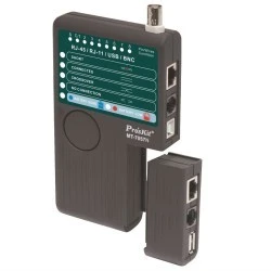 Tester MT-7057N jest uniwersalnym przyrządem do sprawdzania poprawności połączeń przewodów opartych o skrętkę komputerową i zakończonych złączem RJ45 (8P8C), przewodów telefonicznych zakończonych złączem RJ11 lub RJ12, przewodów koncentrycznych zakończonych złączem BNC oraz przewodów USB A/B. Uruchomienie testu następuje z chwilą wciśnięcia przycisku na obudowie urządzenia. Zaletą tego testera jest wbudowany głośnik, który dzięki dodatkowej sygnalizacji dźwiękowej umożliwia pracę także w warunkach słabego oświetlenia. |