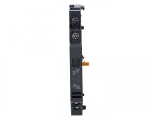 TeSys GV auxiliary contact block, instantaneous auxiliary contacts 1NO+1NC, for motor circuit breakers GV2 and GV3. For AC operation up to 6A/690V and DC operation up to 6A/240V DC. To be installed on left-hand LH side of the circuit breaker, 2 blocks mounting possible, connection by screw clamp terminals. Multi-standards certified (IEC, UL, CSA, CCC, EAC), Green Premium compliant (RoHs/Reach).