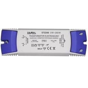 Transformator ETZ250 o mocy wyjściowej 250W, przeznaczony jest do współpracy z halogenowymi źródłami światła, zasilanymi napięciem 12V AC. Cechą charakterystyczną transformatora jest możliwość zasilania bardzo małych obciążeń od 0W. Urządzenie posiada szereg zabezpieczeń (zwarciowe, przeciążeniowe, termiczne) oraz opatentowanych rozwiązań, które zwiększają żywotność żarówek halogenowych współpracujących z transformatorami, oraz poprawiają bezpieczeństwo użytkowania samych urządzeń. ETZ250 przeznaczony jest do montażu natynkowego. Podłączenia dokonuje się za pomocą złącz śrubowych. Transformator może współpracować z inteligentnymi typami ściemniaczy oświetlenia.