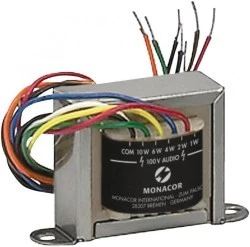 Transformator 100V audio · Wysoka jakość wykonania · Umożliwia podłączanie głośników niskoimpedancyjnych do wzmacniaczy 100V · Moc znamionowa: 10W Moc znamionowa RMS 10 W Strona pierwotna 10/6/4/2/1 W Strona wtórna 4/8/16 Ω Pasmo przenoszenia 35-25 000 Hz Wymiary 71 x 42 x 40 mm Waga 287 g Waga netto 0.287 kg