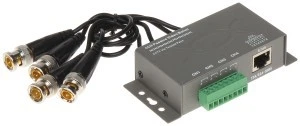 TR-4M przeznaczony jest do przesyłu sygnału wideo za pomocą skrętki komputerowej. Urządzenie dopasowuje impedancję kabla koncentrycznego 75 do impedancji przewodu symetrycznego zapewniając przesył sygnału wizyjnego do 400m (skrętka komputerowa 5 kategorii) oraz eliminuje zakłócenia niesymetryczne. Należy zwrócić uwagę na prawidłowe połączenie zacisków (+) oraz (-). Odwrotne połączenie spowoduje zakłócenia obrazu. Całość zamknięta w metalowej obudowie. SPECYFIKACJA Standard: AHD - 5 Mpx, HD-CVI - 8 Mpx 4K UHD, HD-TVI - 8 Mpx 4K UHD, CVBS - PAL, NTSC Rodzaj urządzenia: Pasywne Liczba kanałów: 4 szt. Wideo Zasięg wideo: 250 m @ 720p - UTP kat. 5e 150 m @ 1080p - UTP kat. 5e 400 m @ CVBS - PAL, NTSC - UTP kat. 5e Napięcie we/wy 75 (CVBS): 1 Vpp Tłumienie: 4.43 MHz @ 0.42 dB 11 MHz @ 0.71 dB 21 MHz @ 1.07 dB 38 MHz @ 1.41 dB 42 MHz @ 1.41 dB 67.5 MHz @ 2.32 dB Separacja między wejściami: > -50 dB CMRR (dB @ 5MHz): 60 dB Impedancja złącza koncentrycznego: 75 Ω Impedancja złącza symetrycznego: 100 Ω Typ złącza koncentrycznego: 4 x BNC Wtyk na przewodzie Typ złącza symetrycznego: Zaciski kablowe / RJ-45 (8-pin, 4 pary) Temperatura pracy: -10 °C ... 70 °C Dopuszczalna względna wilgotność otoczenia: