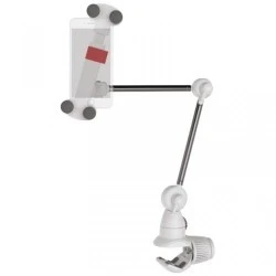 Uchwyt Barkan T580 – Uniwersalny Składany Statyw do Telefonu lub Tabletu 4” - 12” z Pełną Regulacją Położenia, Zacisk do Blatu lub Montaż Ścienny Parametry produktu: Typ uchwytu: Biurkowy Ścienny Składany Regulowany Przeznaczenie: tablet, tablet, czytnik ebook Sposób montażu: Zacisk klamrowy Ścienny Podszafkowy Ilość obsługiwanych urządzeń: 1 Wielkość tabletu (przekątna ekranu): 4” - 12” Maksymalna grubość urządzenia: 10 mm Szerokość zacisku: 12 - 19 cm Orientacja urządzenia: pionowa lub pozioma Maksymalne obciążenie: 1 kg Opcje regulacji: Regulacja nachylenia: 360° Obrót w poziomie (skręt): 360° Obrót w pionie (orientacja): 360° Regulacja wysokości: 50 - 548 mm Kolor: biały Wymiary (szer. x wys. x gł.): 170 x 548 x 70 mm Waga: 0,75 kg Materiał wykonania: stal, tworzywo sztuczne Cechy produktu: Wiele opcji instalacji: składany uchwyt do telefonu lub tabletu 4-12" Barkan posiada wiele opcji montażu, dzięki czemu staje się znakomitym i uniwersalnym narzędziem do nagrywania podcastów, prowadzenia video-konferencji czy szeroko rozumianej rozrywki. Klamra zaciskowa umożliwia montaż na krawędzi blatu (poziomej lub pionowej) o grubości od 0,5 do 5 cm lub wałkach, słupkach czy rolkach o średnicy od 2,5 do 4 cm. Dzięki dołączonemu do zestawu adapterowi uchwyt można również przykręcić do dowolnej płaskich powierzchni (w poziomie lub pionie) jak ściana czy meble Kompatybilność z telefonami i tabletami: regulowana szerokość zacisku z przedziale od 12 do 19 cm gwarantuje bardzo dużą zgodność z wieloma modelami i typami telefonów i tabletów o przekątnej ekranu o 4" do 12". Otwarta konstrukcja zacisku zapewnia łatwą obsługę urządzenia oraz nie blokuje dostępu do portów, w tym ładowania. Swoboda ruchu: dwuramienna konstrukcja z trzema punktami regulacji zakończona przegubem kulowym pozwala na wygodną regulację położenia telefonu w dowolnym kierunku o 360° oraz regulację wysokości od 5 do ok. 55 cm. Dzięki tak dużemu zakresowi ruchu nagrywanie materiałów video czy prowadzenie telekonferencji staje się banalnie proste. Zawartość opakowania: Uchwyt statyw do telefonu lub tabletu 4-12” Adapter do montażu ściennego Elementy montażowe Instrukcja montażu Pokrowiec ochronny
