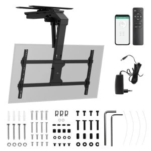 Dzięki elektrycznemu napędowi oraz cichemu silnikowi uchwyt działa niezwykle płynnie, co zwiększa komfort użytkowania, zwłaszcza w domowym salonie, sali konferencyjnej czy pokoju hotelowym. Funkcja obrotu o 90° w lewo i w prawo pozwala na optymalne ustawienie ekranu względem widowni, a regulacja kąta nachylenia do -75° umożliwia wygodne opuszczenie telewizora do pozycji idealnej do oglądania – nawet jeśli zamontowany jest wysoko pod sufitem. Całość można kontrolować za pomocą dołączonego pilota zdalnego sterowania lub przy użyciu popularnej aplikacji Tuya, co pozwala na integrację z inteligentnym systemem domu.