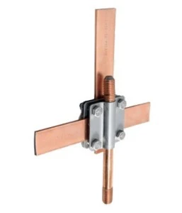 Uchwyt krzyżowy profilowany z czterema śrubami M8 umożliwia łączenie uziomu z bednarką lub przewodem okrągłym.