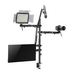 Wysokiej jakości profesjonalny uchwyt do monitora, mikrofonu, kamery i naświetlacza. Umożliwia zamontowanie na biurku wszystkich urządzeń potrzebnych do nagrywania audycji, podcastów, vlogów oraz do streamingu.