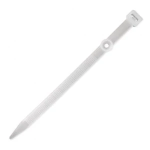 Uchwyt paskowy. Wykonany z polipropylenu uchwyt UP-z składa się z paska zaciskowego o ząbkowanym profilu oraz otworu do mocowania uchwytu do podłoża za pomocą gwoździa/wkrętu. Służy do mocowania przewodów, ich wiązki lub rurek instalacyjnych. Cena dotyczy opakowania 50 szt.
