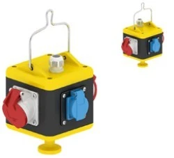 Uni-Block rozdzielnica podwieszana stopień ochrony : IP 44 obudowa : w pełni gumowa 140 x 140 mm z uchwytem i wieszakiem wyposażenie : 2 x gniazdo jednofazowe 16A 230V Typ: 7138 2 x CEE-gniazdo 16A 400V 5P Typ: 12980 zasilanie.: 1 x M25 dławik z góry
