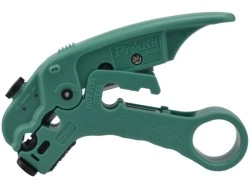 Profesjonalny, uniwersalny ściągacz renomowanej marki Proskit. Przeznaczony do zdejmowania izolacji z przewodów koncentrycznych oraz skrętki komputerowej. Idealny do ściągania izolacji z kabli solarnych o przekroju 2,5 / 4 / 6 mm². Pomaga odizolować, przyciąć i przygotować przewód.