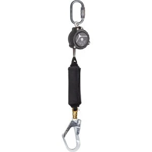 Urządzenie samohamowne z taśmą 19,5 mm oraz amortyzatorem. Obudowa z poliamidu. 1 krętlik ze znacznikiem upadku. 1 łącznik odpinany. 1 hak aluminiowy, otwór 51 mm.