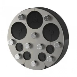 Uszczelnienie wykonane w w wersji dzielonej HRD dla średnicy otworu Ø200mm, przeznaczone do wykonywania ciśnieniowych przejść gazo i wodoszczelnych dla rur, przewodów i kabli przechodzących przez przegrody budowlane. Uszczelnienie składa się z pierścienia EPDM wraz z zaślepkami oraz płyt dociskowych, śrub, nakrętek i podkładek ze stali nierdzewnej V2A.