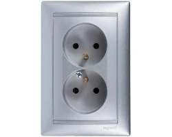 Prezentowane gniazdo jest podwójne i posiada bolec uziemiający. Materiał, jakiego użyto podczas produkcji tego osprzętu, to wytrzymałe i najlepsze gatunkowo tworzywo termoplastyczne w kolorze aluminium. Wykończenie powierzchni jest błyszczące. Osprzęt z pewnością będzie pasował do wielu pomieszczeń o różnych wystrojach. Producent nie wyposażył gniazda w etykietę. Napięcie znamionowe w tym gnieździe sięga 250 V, natomiast prąd znamionowy może dojść do 16 A. Producent zaleca wykonanie montażu podtynkowego przy pomocy pazurków i śruby. Połączenie do obwodu jest wtykowe, samozaciskowe. Stopień ochrony tego gniazda to IP20, co mówi o odporności na ciała obce o średnicy 12,5 mm, gniazda nie można jednak wykorzystywać na zewnątrz, gdzie będzie narażone na warunki atmosferyczne. Produkt nie posiada specjalnego zasilania. Nie ma również bezpiecznika miniaturowego i podświetlenia. Osprzęt nie posiada zabezpieczenia przed dziećmi. Wykonała go znana i ceniona marka LEGRAND, która na światowym rynku działa od 1860 roku i od tego czasu bardzo ewoluowała, stając się jednym z wiodących producentów aparatury tego typu.