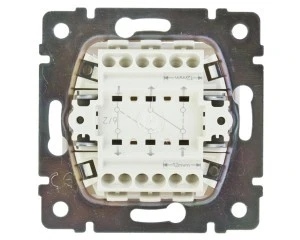 Łącznik z serii VALENA wytworzono z bardzo wytrzymałego tworzywa termoplastycznego w kolorze białym. Wykończenie powierzchni jest błyszczące, zatem dopasuje się do wielu nowoczesnych wnętrz. Łącznik posiada dwie dźwignie, którą uruchamia się w sposób wahadłowy. Jego napięcie sięga 250 V. Osprzęt pełni funkcję łącznika przełącznego/schodowego. Prąd łącznika może dojść do 10 A. Łącznik nie może być przełącznikiem pralkowym, nie ma przycisku. Producent zaleca wykonanie montażu podgtynkowego poprzez mocowanie śrubowe. IP20, to stopień ochrony jakim się charakteryzuje. Mówi on o ochronie na ciała obce o średnicy min, 12,5 mm. Osprzęt nie będzie chroniony przed szkodliwym działaniem wody i wilgoci. Prąd łączeniowy do świetlówek wynosi 10 AX. Osprzęt nie posiada styków sygnału zwrotnego ani podświetlenia. Wykonawcą jest marka LEGRAND - bardzo znany producent wśród producentów osprzętu elektroinstalacyjnego. Marka istnieje od XIX wieku, a zgromadzone doświadczenie pozwala im na uzyskanie pozycji lidera na światowym rynku.