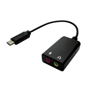 - Kabel adaptera przekształca USB typu C w dwa gniazda audio 3,5 mm, po jednym dla mikrofonu i słuchawek.