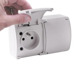 ? Przedmiotem oferty jest 1 szt. Gniazdo podwójne bryzgoszczelne z białymi klapkami.