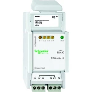Wejście binarne REG-K/4x10, jasnoszary. rodzina produktów: KNX - typ produktu: wejście binarne - typ magistrali: KNX. Zalety: System KNX Schneider Electric proponuje jedno kompleksowe rozwiązanie osadzone w międzynarodowych standardach i produkowane przez wielu producentów, oferujące maksymalną elastyczność, komfort, bezpieczeństwo i efektywność instalacji elektrycznej zwłaszcza w przypadku nowych budynków. Idea KNX jest tak prosta, że aż genialna. KNX łączy wszystkie główne funkcje dotyczące zarządzania instalacją elektryczną w budynku, a mianowicie oświetlenie, ogrzewanie, klimatyzacja które to są połączone w inteligentny system, który pomaga obniżyć koszty operacyjne wynikające w znacznej oszczędności energii. System KNX zwiększa elastyczności instalacji i jej dostosowanie do przyszłych, zmieniających się w czasie funkcji budynku.... Zastosowanie: Rozwiązania KNX Schneider Electric są adresowane do budynków komercyjnych, jak również wysokiej klasy rezydencji:, Budynki biurowe, Budynki użyteczności publicznej, Hotele, Szkoły, Szpitale, Sklepy i centra handlowe, Rezydencje i apartamenty -. Zarządzanie funkcjami budynku dzięki KNX jest jednym z najbardziej efektywnych wariantów zmniejszenia konsumpcji energii i poprawy efektywności jej zużycia. Szczególnie w przypadku kompleksów biurowych, KNX uwidacznia swój potencjał....