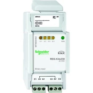 Wejście binarne REG-K/4x230, jasnoszary. rodzina produktów: KNX - typ produktu: wejście binarne - typ magistrali: KNX. Zalety: System KNX Schneider Electric proponuje jedno kompleksowe rozwiązanie osadzone w międzynarodowych standardach i produkowane przez wielu producentów, oferujące maksymalną elastyczność, komfort, bezpieczeństwo i efektywność instalacji elektrycznej zwłaszcza w przypadku nowych budynków. Idea KNX jest tak prosta, że aż genialna. KNX łączy wszystkie główne funkcje dotyczące zarządzania instalacją elektryczną w budynku, a mianowicie oświetlenie, ogrzewanie, klimatyzacja które to są połączone w inteligentny system, który pomaga obniżyć koszty operacyjne wynikające w znacznej oszczędności energii. System KNX zwiększa elastyczności instalacji i jej dostosowanie do przyszłych, zmieniających się w czasie funkcji budynku.... Zastosowanie: Rozwiązania KNX Schneider Electric są adresowane do budynków komercyjnych, jak również wysokiej klasy rezydencji:, Budynki biurowe, Budynki użyteczności publicznej, Hotele, Szkoły, Szpitale, Sklepy i centra handlowe, Rezydencje i apartamenty -. Zarządzanie funkcjami budynku dzięki KNX jest jednym z najbardziej efektywnych wariantów zmniejszenia konsumpcji energii i poprawy efektywności jej zużycia. Szczególnie w przypadku kompleksów biurowych, KNX uwidacznia swój potencjał....