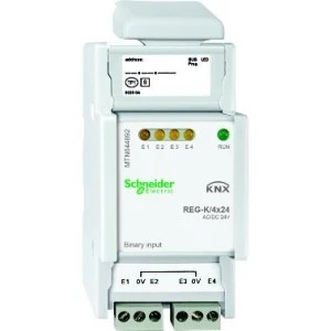 Wejście binarne REG-K/4x24, jasnoszary. rodzina produktów: KNX - typ produktu: wejście binarne - typ magistrali: KNX. Zalety: System KNX Schneider Electric proponuje jedno kompleksowe rozwiązanie osadzone w międzynarodowych standardach i produkowane przez wielu producentów, oferujące maksymalną elastyczność, komfort, bezpieczeństwo i efektywność instalacji elektrycznej zwłaszcza w przypadku nowych budynków. Idea KNX jest tak prosta, że aż genialna. KNX łączy wszystkie główne funkcje dotyczące zarządzania instalacją elektryczną w budynku, a mianowicie oświetlenie, ogrzewanie, klimatyzacja które to są połączone w inteligentny system, który pomaga obniżyć koszty operacyjne wynikające w znacznej oszczędności energii. System KNX zwiększa elastyczności instalacji i jej dostosowanie do przyszłych, zmieniających się w czasie funkcji budynku.... Zastosowanie: Rozwiązania KNX Schneider Electric są adresowane do budynków komercyjnych, jak również wysokiej klasy rezydencji:, Budynki biurowe, Budynki użyteczności publicznej, Hotele, Szkoły, Szpitale, Sklepy i centra handlowe, Rezydencje i apartamenty -. Zarządzanie funkcjami budynku dzięki KNX jest jednym z najbardziej efektywnych wariantów zmniejszenia konsumpcji energii i poprawy efektywności jej zużycia. Szczególnie w przypadku kompleksów biurowych, KNX uwidacznia swój potencjał....