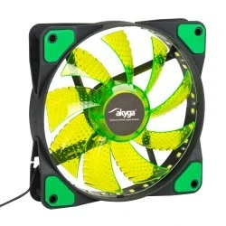 Wentylator Akyga® AW-12E-BG to wysokiej jakości chłodzenie do komputera stacjonarnego. Posiada 9 specjalnie zaprojektowanych łopatek umieszczonych na wytrzymałym łożyskom ślizgowym. Zapewniają one wiele godzin cichej i bezawaryjnej pracy na najwyższych obrotach. Ponadto, dla uzyskania jeszcze większej ciszy, wentylator wyposażono w podkładki gumowe, które powstrzymują powstawanie ewentualnych wibracji. Co więcej, łopatki wiatraka zostały podświetlone 33 zielonymi diodami LED. Dzięki temu wentylator może posłużyć do wyeksponowania wnętrza obudowy ATX. Dodatkowo długi 30 cm przewód zapewni swobodę montażu w obudowie. Natomiast złącze Molex pozwoli w łatwy sposób podłączyć wentylator do dowolnego zasilacza komputerowego wyposażonego w odpowiednie złącze.