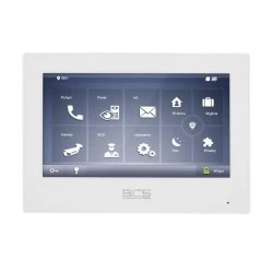 Wideomonitor IP, obudowa z tworzywa sztucznego w kolorze białym, pojemnościowy dotykowy ekran 7" TFT, rozdzielczość 1024*600, podgląd kamer IP BCS Line oraz Onvif, zasilanie 12VDC lub PoE 802.3 at/af/passive, max rozbudowa do 10 monitorów w jednym lokalu dla systemów jednorodzinnych i do 5 dla systemów wielorodzinnych, wsparcie kodowania H.264, oraz H.265, wyjście przekaźnikowe NO, COM, gniazdo karty pamięci wbudowane w płytę główną (brak karty w komplecie).