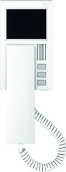 Wideomonitor słuchawkowy; 4" kolorowy wyświetlacz; biały; do systemu PRO (typ instalacji: skrętka cat. 5e lub 6: UTP); 3 stopniowa regulacja głośności dzwonka; magnetyczne odkładanie słuchawki; 3 przyciski: otwieranie/funkcyjny/podgląd; funkcja dzwonka do drzwi; sygnalizacja optyczna wyciszenia i dzwonienia; interkom (tylko odbieranie rozmowy). *Kompatybilny z Familio/Como PRO.
