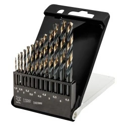 Zestaw wierteł do metalu GRAPHITE (nr ref. 55H089) o średnicach od 1.0 do 10.0 mm, wykonanych z wysokogatunkowego stopu stali szybkotnącej metodą obróbki CNC. Dzięki specjalnemu ostrzeniu, idealnie nadają się do wiercenia precyzyjnych otworów we wszystkich rodzajach metali