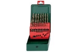 Wiertła do metalu HSS-CO z domieszką kobaltu, szlifowane, cylindryczne, typ N, oszlifowanie krzyżowe 135°, powierzchnia brązowa, 19 części, w kasecie z metalu