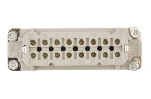 Wkład złącza marki Lapp Kabel to wysokogatunkowe urządzenie, które w powyższym modelu nadaje się do stosowania w pomieszczeniach oraz poza nimi. Artykuł ten jest odporny bowiem na działanie wody, pyłu i kurzu. Stopień jego ochrony oznaczono symbolem IP65. Dużą rolę gra tutaj materiał, z jakiego wykonano produkt, a jest nim tworzywo sztuczne. Wkład posiada 16 styków pokrytych srebrem oraz 2 tory stykowe. Styki wykonano jako gniazdo. Do obwodu głównego urządzenie należy podłączyć za pomocą śrub mocujących, których wykorzystanie zaleca sam producent. Długość wkładu mierzy 73 mm, jego szerokość jest równa 23 mm, a wysokość to 31,1 mm. Przekrój przyłączanego przewodu jednodrutowego, ale również wielożyłowego i linkowego z końcówką tulejkową oraz bez takiej końcówki wynosi od 0,5 mm2 do 2,5 mm2. Znamionowy prąd w przypadku tego urządzenia może sięgać 16 A. Znamionowe napięcie udarowe ma wartość 4 kV, natomiast napięcie sterowania jest równe 250 V. Temperatura, przy jakiej wkład będzie efektywnie działał wynosi od -40 oC do +100 oC.