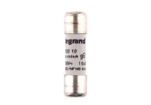Wkładka bezpiecznikowa cylindryczna 10x38 mm, typ gG, znamionowy prąd 10 A i napięcie 500 V, przeznaczona do zabezpieczania obwodów elektrycznych w instalacjach przemysłowych i rozdzielnicach. Konstrukcja 10x38 umożliwia montaż w standardowych gniazdach i uchwytach dla tej grupy wkładek.