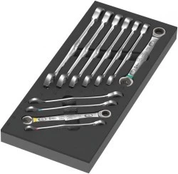 Zestaw 11 narzędzi z kluczami płasko-oczkowymi z grzechotką 6000 Joker w dwukolorowej wkładce piankowej do wózka warsztatowego Tool Rebel. Szerokość x wysokość x głębokość: bez narzędzi 172 x 30 x 392 mm, z narzędziami 172 x 47 x 392 mm.
