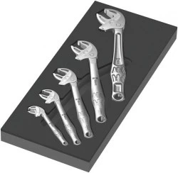 Zestaw 5 narzędzi z samonastawnymi kluczami płaskimi 6004 Joker w dwukolorowej wkładce piankowej do wózka warsztatowego Tool Rebel. Szerokość x wysokość x głębokość: bez narzędzi 172 x 30 x 392 mm, z narzędziami 172 x 35 x 392 mm.