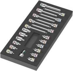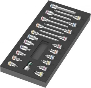 Trwała wkładka piankowa; dwukolorowa, umożliwiająca szybką identyfikację brakujących elementów; pasuje do wózka warsztatowego Tool Rebel; wyposażona w 21 kluczy trzpieniowych nasadowych Wera 3/8" i 1 adapter z uchwytem szybkomocującym do bitów ¼".