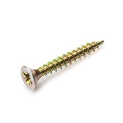 Hartowany wkręt do drewna i do płyt wiórowych z łbem stożkowym płaskim, pełny gwint, nacięcie krzyżowe PZ, ocynkowany na żółto, woskowany.