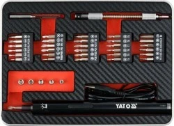 Precyzyjny wkrętak akumulatorowy marki YATO YT-27930 wraz z zestawem bitów i przedłużek, przeznaczony do prac precyzyjnych m.in. napraw sprzętu elektronicznego.