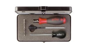 Zestaw wkretaków dynamometrycznych TorqueVario®-S zapewnia odpowiednio bezpieczny moment obrotowy podczas pracy. Zestaw narzedzi obejmuje ergonomicznie uksztaltowany uchwyt wkretaka dynamometrycznego ze zintegrowana skala numeryczna, 10 najczesciej uzywanych bitów do wszelkich zastosowan, uchwyt na bity oraz narzedzie nastawcze. Wszystkie te komponenty sa rozmieszczone w sposób praktyczny i przejrzysty w wysokiej jakosci stabilnej kasecie. Wkretak dynamometryczny dzieki momentowi dokrecania regulowanemu w zakresie 0,8-5,0 Nm znajduje szerokie zastosowanie. Wyraznie slyszalny i odczuwalny sygnal przylozenia momentu obrotowego zapewnia niezawodne dzialanie tego mechanizmu, które chroni przed uszkodzeniem materialu oraz zapobiega niepotrzebnemu nakladowi pracy. Przy dokladnosci zadzialania +/- 6% to narzedzie dynamometryczne spelnia wymogi normy DIN EN ISO 6789.