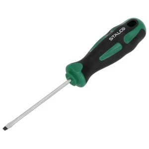 Wkrętak płaski należy do podstawowych narzędzi warsztatowych ręcznych. Służy do wkręcania i odkręcania śrub wyposażonych w pojedyncze podłużne nacięcie na łbie. Sprawdza się również przy podważaniu połączonych elementów konstrukcji i gwoździ. Znajdzie zastosowanie w pracach budowlanych i w warsztatach rzemieślniczych. Przyda się przy profesjonalnych i amatorskich pracach w wielu dziedzinach. Wkrętak płaski STALCO jest wykonany ze stali chromowo-wanadowej. Ten materiał zapewnia dużą wytrzymałość na pękanie i ścieranie, odporność na korozję, a także trwałość w wysokich temperaturach. Wygodna rękojeść umożliwia komfortowe prowadzenie pracy nawet mokrymi dłońmi i w rękawicy. Wkrętak płaski STALCO jest oferowany w wariantach o długości trzpienia od 75 do 150 mm i szerokościach płaskiego elementu w zakresie od 3 do 8 mm.