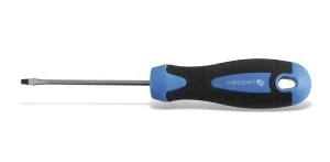 Wkrętak płaski HT1S014 o szerokości grotu 6 mm i długości trzonka 150 mm przeznaczony do montażu i serwisu instalacji elektrycznych oraz prac przemysłowych wymagających precyzyjnego dokręcania. Narzędzie typu ręcznego z grotem szlifowanym ze stali stopowej S2.
