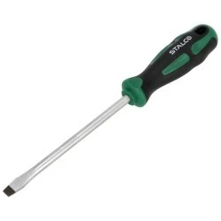 Wkrętak płaski należy do podstawowych narzędzi warsztatowych ręcznych. Służy do wkręcania i odkręcania śrub wyposażonych w pojedyncze podłużne nacięcie na łbie. Sprawdza się również przy podważaniu połączonych elementów konstrukcji i gwoździ. Znajdzie zastosowanie w pracach budowlanych i w warsztatach rzemieślniczych. Przyda się przy profesjonalnych i amatorskich pracach w wielu dziedzinach. Wkrętak płaski STALCO jest wykonany ze stali chromowo-wanadowej. Ten materiał zapewnia dużą wytrzymałość na pękanie i ścieranie, odporność na korozję, a także trwałość w wysokich temperaturach. Wygodna rękojeść umożliwia komfortowe prowadzenie pracy nawet mokrymi dłońmi i w rękawicy. Wkrętak płaski STALCO jest oferowany w wariantach o długości trzpienia od 75 do 150 mm i szerokościach płaskiego elementu w zakresie od 3 do 8 mm.
