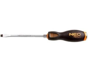 Wkrętak płaski do pobijania NEO (nr ref. 04-019) o wymiarach 6.5 x 125 mm. Specjalnie wzmocniony grot wkrętaka wykonany jest z wyjątkowo wytrzymałej stali S2. Końcówka robocza grota została poddana obróbce cieplnej, dzięki czemu uzyskano odpowiednią twardość i odporność na zgięcia 56 HRC. Wkrętak posiada magnetyczną końcówkę i uchwyt do pobijania. Trójgraniasty kształt uchwytu z wyprofilowanym oparciem dla kciuka zmniejsza obciążenie dłoni podczas pracy i ułatwia uzyskanie optymalnego momentu obrotowego. Dwumateriałowy uchwyt zapobiega ślizganiu się w dłoni, odporny jest na działanie chemikaliów, olejów i smarów. Jakość narzędzia potwierdzona certyfikatem TUV i 25-letnią gwarancją producenta. Marka NEO spełnia oczekiwania profesjonalistów.