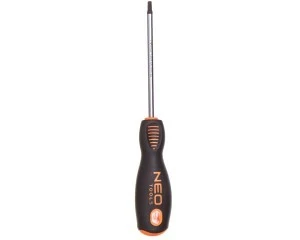 Wkrętak Torx NEO (nr ref. 04-045) o wymiarach T20 x 100 mm. Grot wkrętaka wykonany jest z wyjątkowo wytrzymałej stali chromowo-molibdenowej. Końcówka robocza grota została poddana obróbce cieplnej, dzięki czemu uzyskano odpowiednią twardość i odporność na zgięcia 56 HRC. Wkrętak posiada magnetyczną końcówkę. Trójgraniasty kształt uchwytu z wyprofilowanym oparciem dla kciuka zmniejsza obciążenie dłoni podczas pracy i ułatwia uzyskanie optymalnego momentu obrotowego. Dwumateriałowy uchwyt zapobiega ślizganiu się w dłoni, odporny jest na działanie chemikaliów, olejów i smarów. Jakość narzędzia potwierdzona certyfikatem TUV i 25-letnią gwarancją producenta. Marka NEO spełnia oczekiwania profesjonalistów.