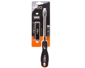 Wkrętak z giętkim grotem NEO (nr ref. 04-212) zawiera uchwyt, 10 końcówek wkrętakowych (płaskich, krzyżowych, Torx) i adapter. Magnetyczne końcówki wykonane są z wyjątkowo wytrzymałej stali chromowo-molibdenowej. Giętki grot umożliwia pracę w trudno dostępnych miejscach. Trójgraniasty kształt rękojeści z wyprofilowanym oparciem dla kciuka zmniejsza obciążenie dłoni podczas pracy i ułatwia uzyskanie optymalnego momentu obrotowego. Dwumateriałowy uchwyt odporny jest na działanie chemikaliów, olejów i smarów. Jakość narzędzia potwierdzona certyfikatem TUV i 25-letnią gwarancją producenta. Marka NEO spełnia oczekiwania profesjonalistów.