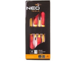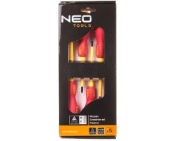 Zestaw wkrętaków, atestowany dopracy znapięciem do1000V. Zawiera pięć narzędzi płaskich orazkrzyżowych. Ich groty wykonane są zwyjątkowo wytrzymałej stali chromowo‑molibdenowej. Końcówka robocza wkrętaka została dodatkowo poddana obr/óbce cieplnej, dzięki czemu narzędzie posiada odpowiednią twardość orazodporność na zgięcia 56HRC.