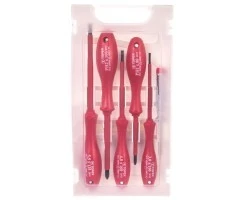Wkrętaki 1000V, zestaw 6 szt., z certyfikatem, stal CrMo, rozmiary: 3 x 100 mm, 4 x 100 mm, 5.5 x 100 mm, PH1 x 80 mm, PH2 x 100 mm, próbnik 125-250V