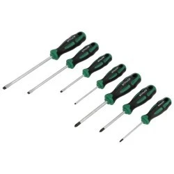 W każdym warsztacie i w obrębie stanowiska pracy powinny znaleźć się wkrętki ręczne. Przedstawiany tu komplet zawiera siedem różnych narzędzi, które mają odmienne długości trzpienia i kilka rodzajów końcówek roboczych. W tym zestawie zebraliśmy cztery wkrętaki płaskie i trzy zakończone gniazdami krzyżakowymi typu Philips. Taka różnorodność pozwala na wykonywanie nimi wielu prac wymagających różnego poziomu precyzji. Wszystkie wkrętaki STALCO, zgromadzone w tym zestawie, są wykonane z dbałością o szczegóły i jakość. Trzpienie ze stali chromowo-wanadowej są odporne na ścieranie, pękanie i korozję, co pozwala użytkować je długo. Na duży komfort pracy wkrętakami wpływa raczka z tworzywa sztucznego o ergonomicznym kształcie.