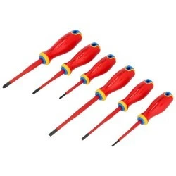 Zestaw 6 wkrętaków, atestowanych do pracy z napięciem l000V, wyposażonych w ergonomiczny 3 materiałowy, antypoślizgowy uchwyt, a groty wkrętaków wykonane ze stali S2. Cechy jakość i bezpieczeństwo potwierdzone certyfikatem VDE GS oraz normą I EC 60900, groty wkrętaków wykonane ze stali S2, 3-materiałowy ergonomiczny, antypoślizgowy uchwyt, zestaw zawiera wszystkie najpopularniejsze rozmiary, cześć robocza wkrętaka z izolacją typu „SLIM" zapewniająca możliwość pracy w trudno dostępnych miejscach. SL: 2,5 x 75 mm, 4.0 x 100 mm , 5,5 x 125 mm PH: PH0 x 60 mm, PHl x 80 mm, PH2 x 100 mm