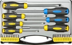 Wkrętaki i końcówki wkrętakowe, zestaw 27 szt., hartowana końcówka, magnetyczna końcówka, stal CrV, dwumateriałowy uchwyt, 6 szt. wkrętaków, rozmiary: 3.2 x 75 mm, 4 x 100 mm, 5 x 100 mm, 6.5 x 150 mm, PH1 x 100 mm, PH2 x 150 mm, uchwyt wkrętakowy do końcówek wkrętakowych, 19 szt. końcówek wkrętakowych, rozmiary: płaskie 4.5 mm, 6 mm, 7 mm, krzyżowe PH0, PH1, PH2, PH3, Torx T10, T15, T20, T25, T27, T30, T40, sześciokątne H2, H3, H4, H5, H6, adapter do nasadek, walizka