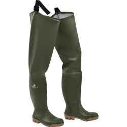 Płótno powlekane: PVC, wysokość: 80 cm. Szwy zgrzewane na gorąco 100% wodoszczelne. Podszewka: dżersej bawełniany. Nylonowe paski mocujące. Ochrona kostek. Tylna pętla do ściągania obuwia. Podnosek ochronny: stal nierdzewna. Wkładka antyprzebiciowa: stal nierdzewna. Podeszwa: PVC - Nitryl z dużymi zaczepami.
