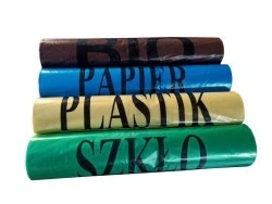 Zakup jednego kompletu oznacza zakup 100 szt. worków z nadrukiem, o pojemności 120 L, po 1 rolce (25szt.) każdego koloru worków w zestawie.